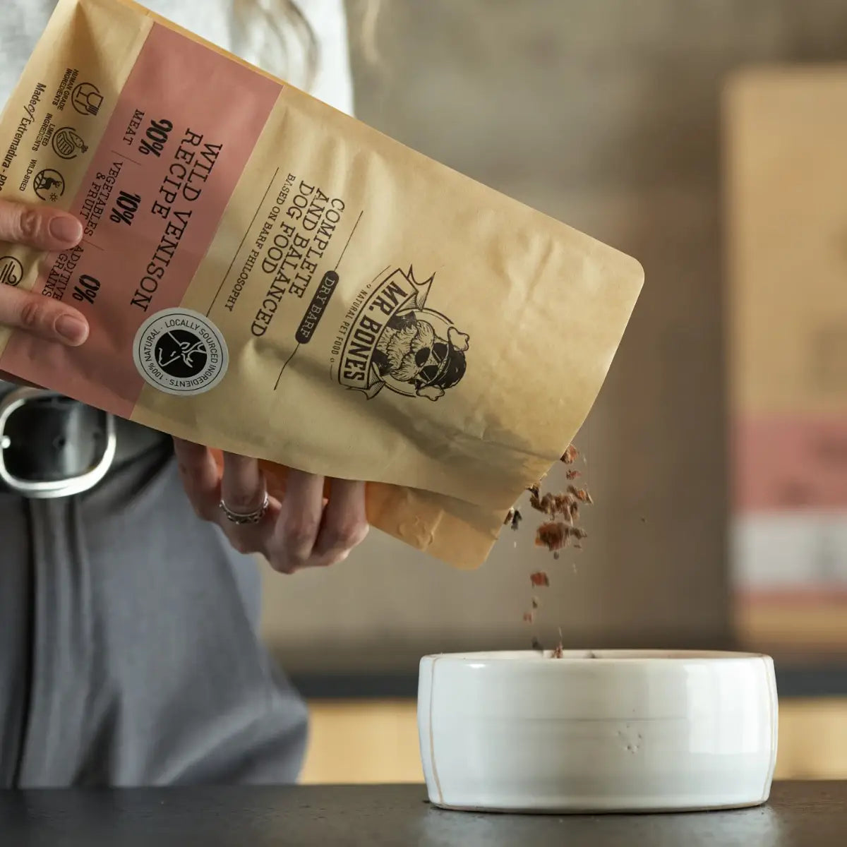 Dry BARF - Hjort og grønn vom er et komplett og naturlig fôr til hund, inspirert av BARF-dietten. Fôret er skånsomt lufttørket på lav temperatur for å bevare smak, aroma og næringsstoffer. Laget av ferskt kjøtt, kjøttfulle bein, næringsrike organer samt ekte frukt og grønnsaker.