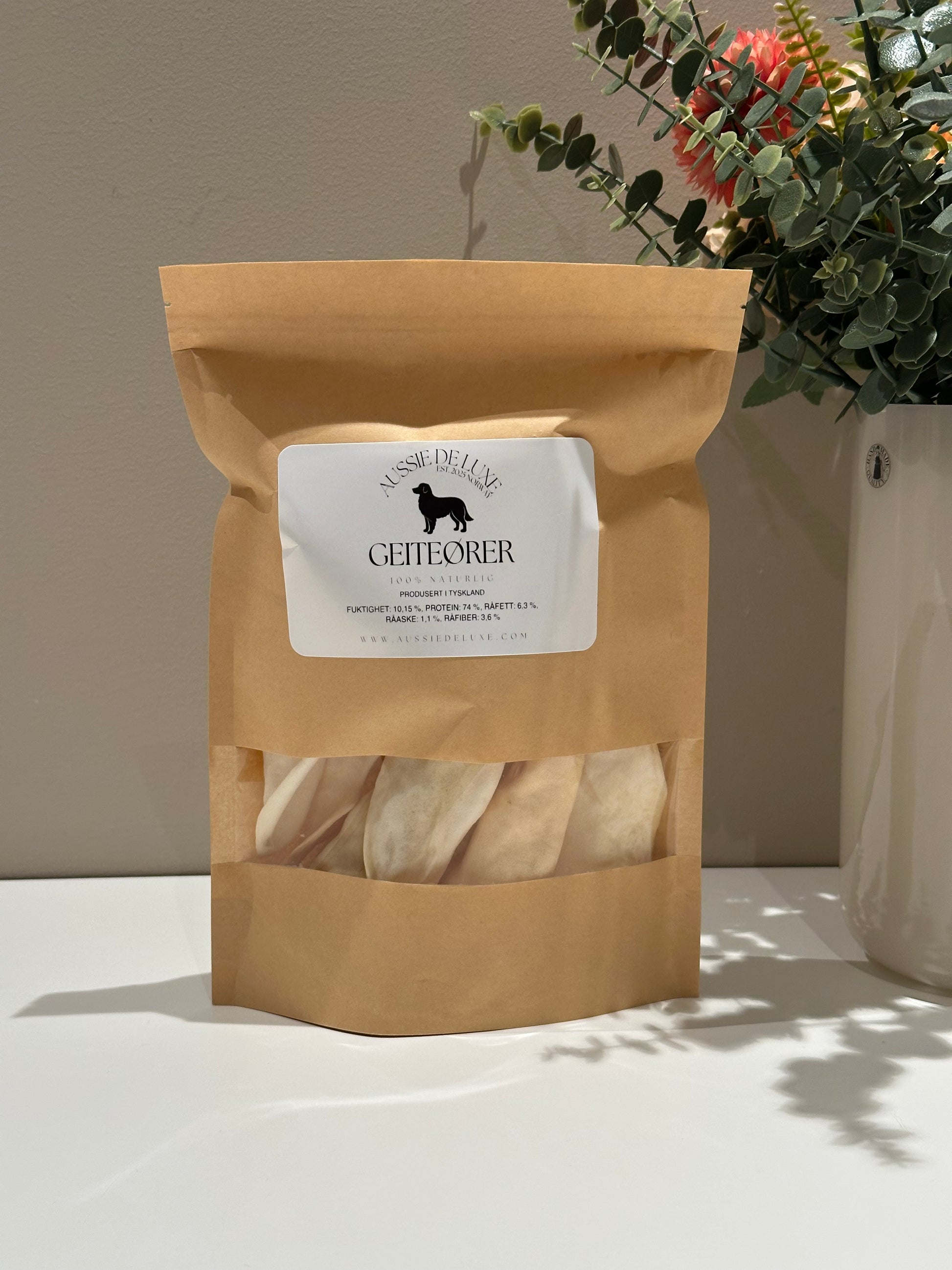 Geiteører er en smakfull og naturlig tyggesnack, helt uten konserveringsmidler. Den faste strukturen gir hunden langvarig tyggeglede, styrker kjevemuskulaturen og kan bidra til naturlig tannpleie.