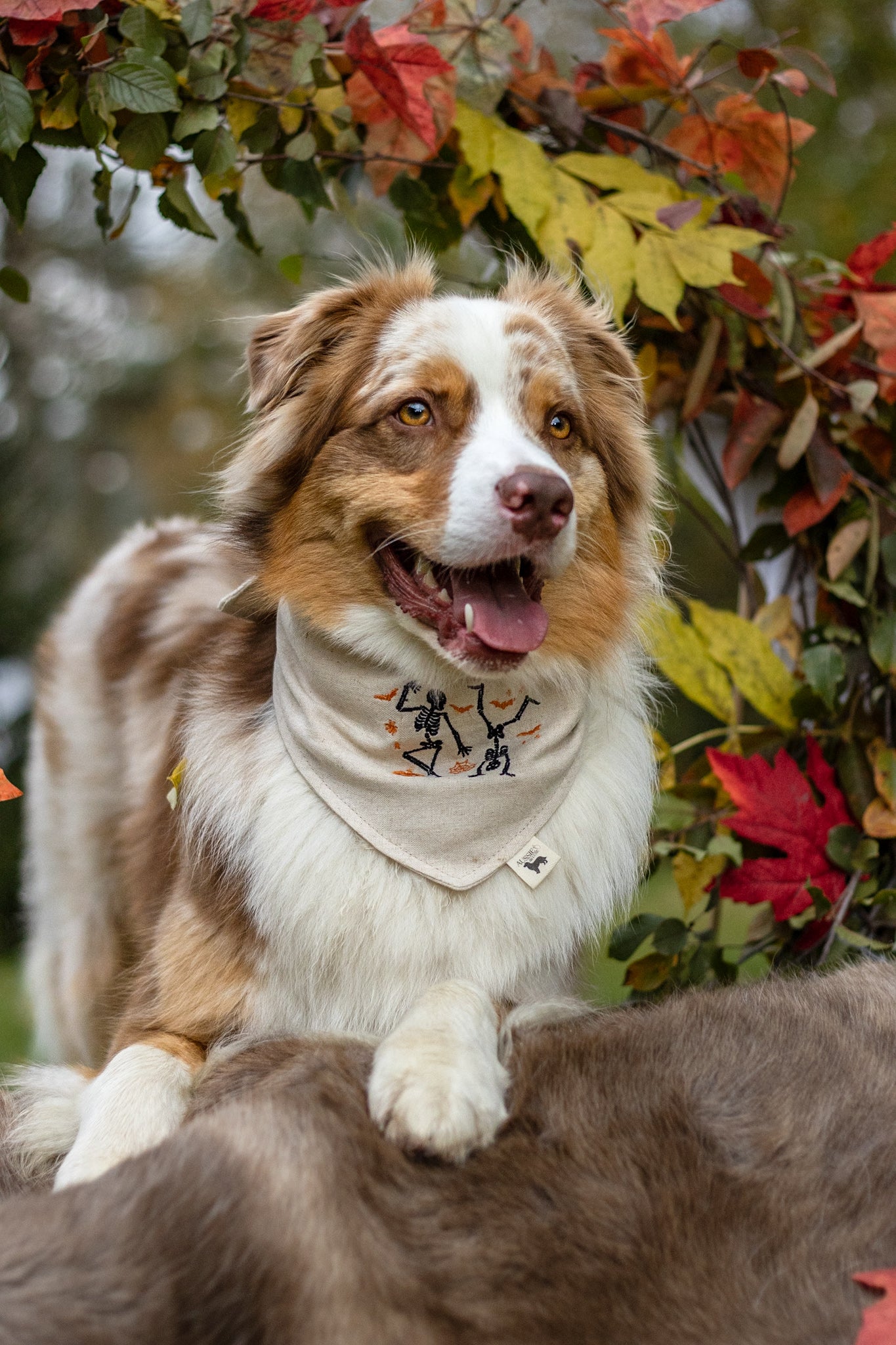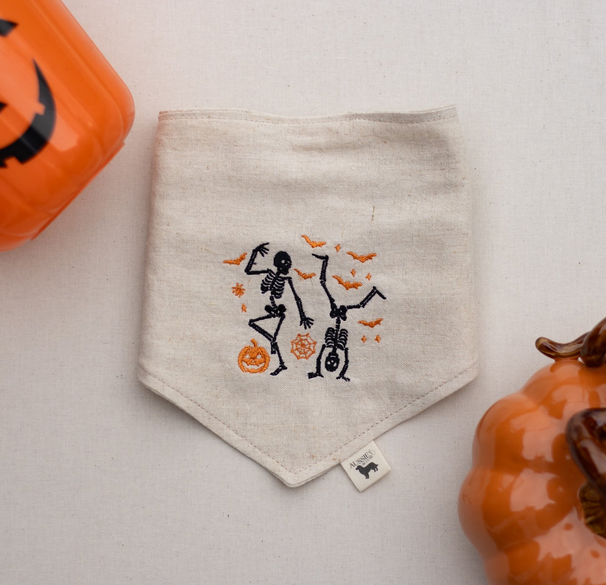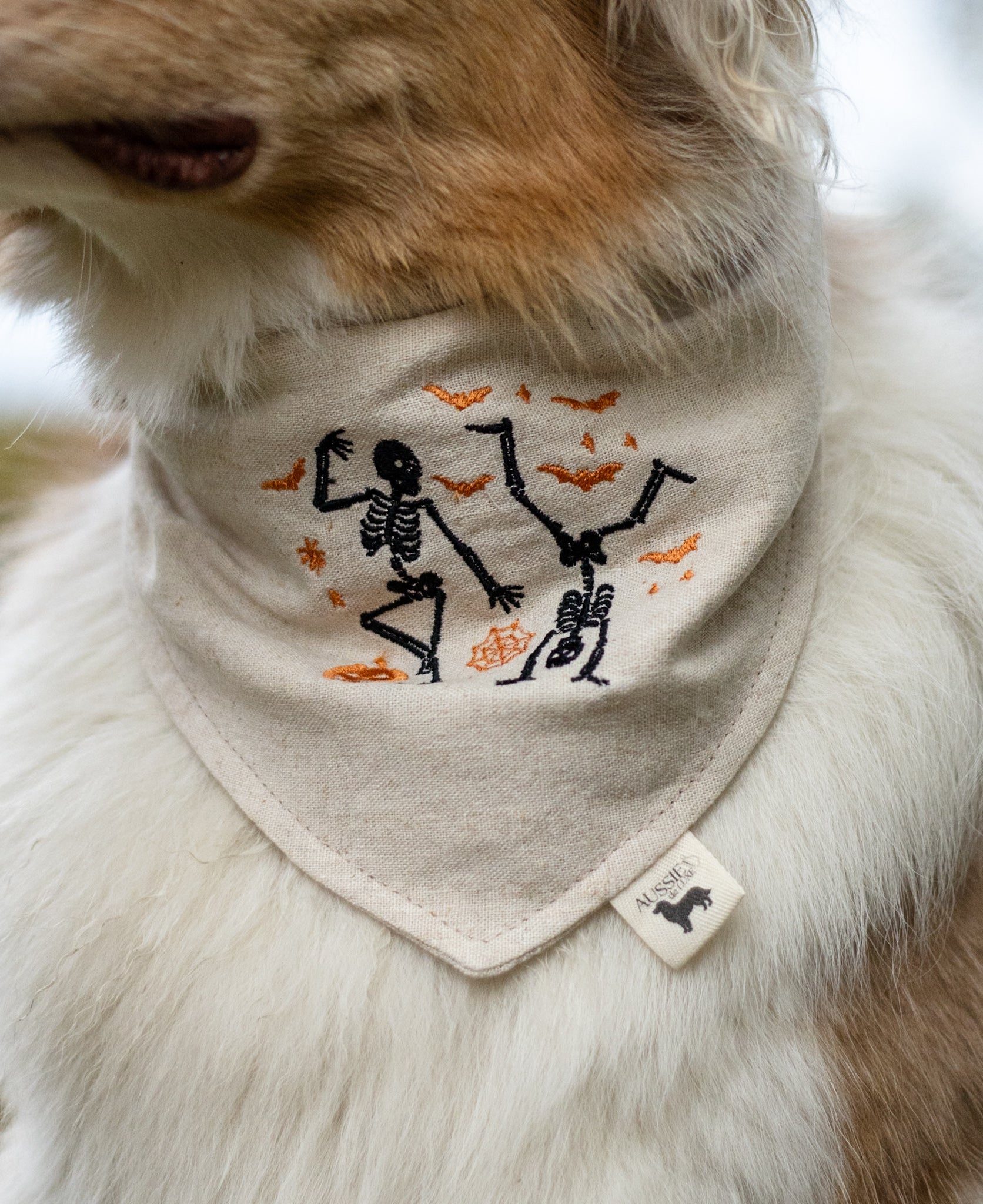 Skjelettboogie er en leken sesongbandana, som er brodert med dansende skjeletter, gresskar og flaggermus. Denne er perfekt for små og store firebeinte som liker litt Halloween-stemning.