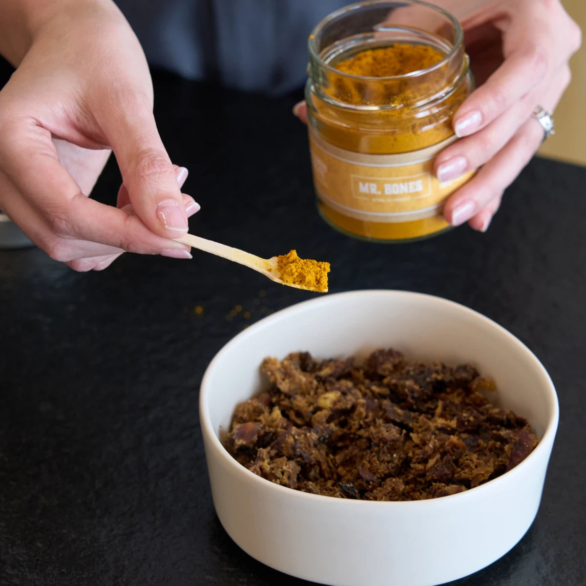 Pulverblanding av gurkemeie, sort pepper, kokos, kanel og ingefær. Dette er ingredienser som tradisjonelt har vært verdsatt for sine naturlige egenskaper. En aromatisk og funksjonell kombinasjon som er laget for å komplettere hundens og kattens daglige kosthold med nøye utvalgte ingredienser basert på deres ernæringsprofil.