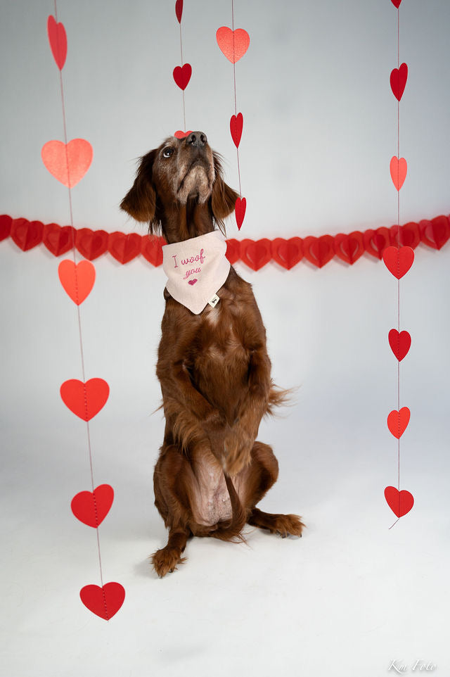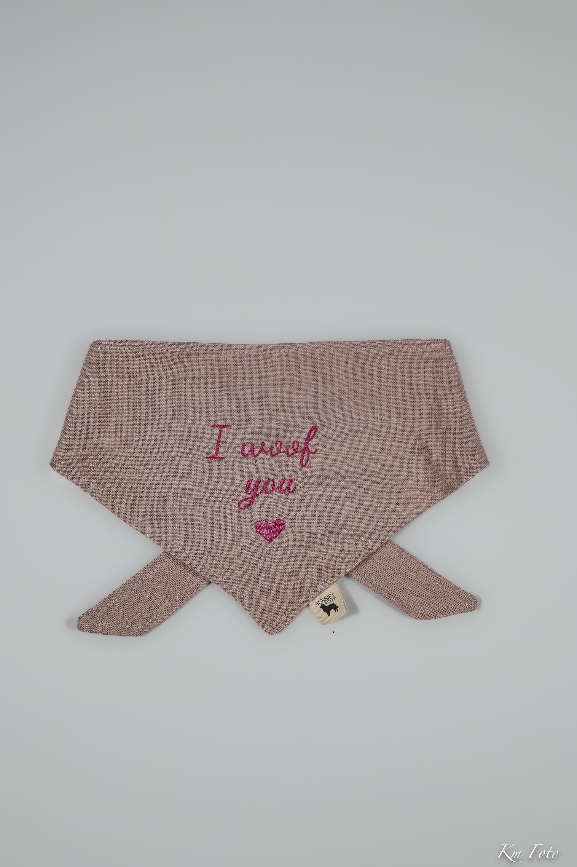 Tidløs Kjærlighet er en bandana med et rolig og elegant uttrykk. Designet er brodert med teksten «I woof you» og et lite hjerte, en diskret, men kjærlig detalj som passer like fint til hverdags som til spesielle anledninger.