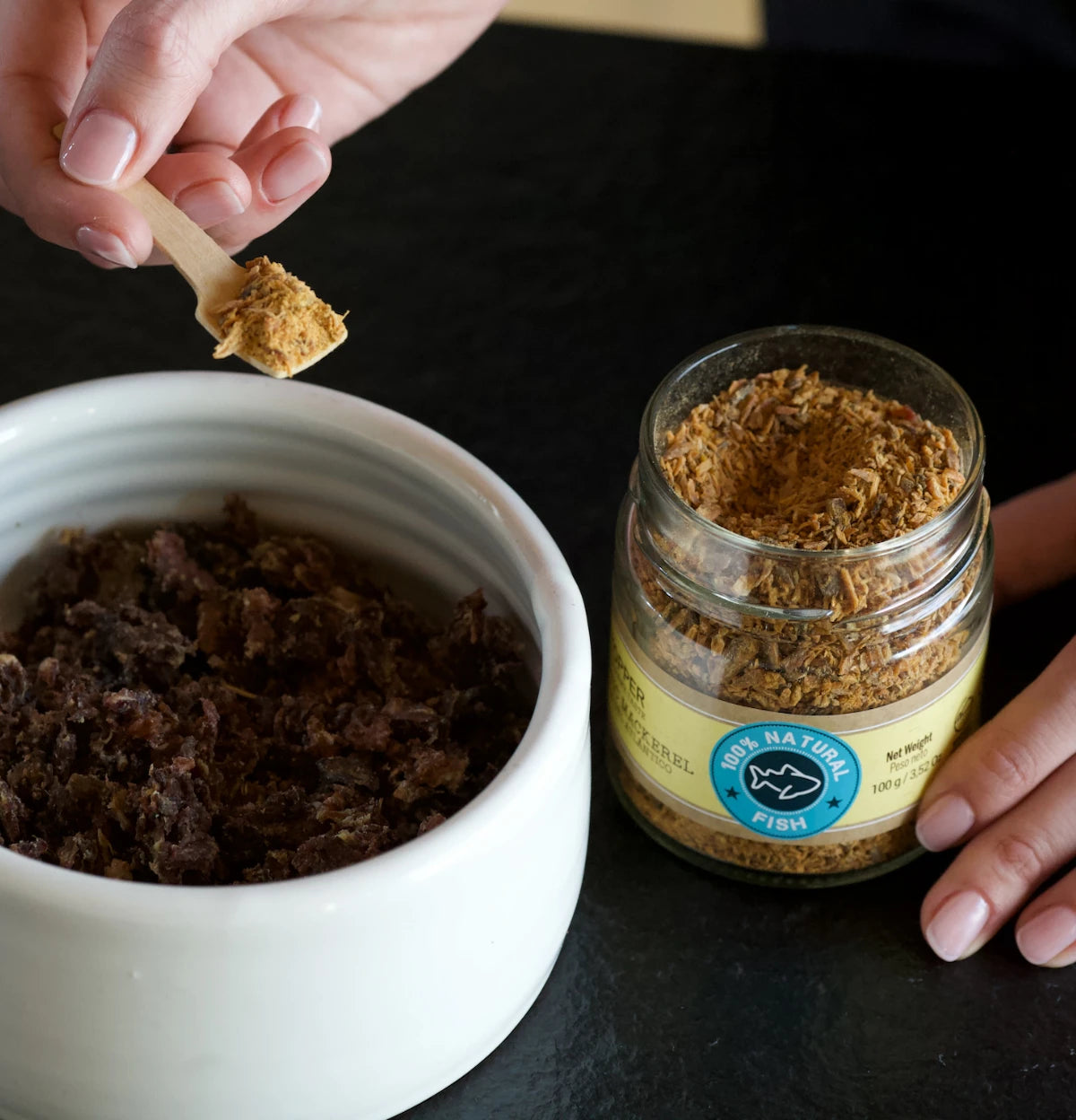 Dryss eller bland en liten mengde Makrell Topper over hundens eller kattens vanlige fôr.